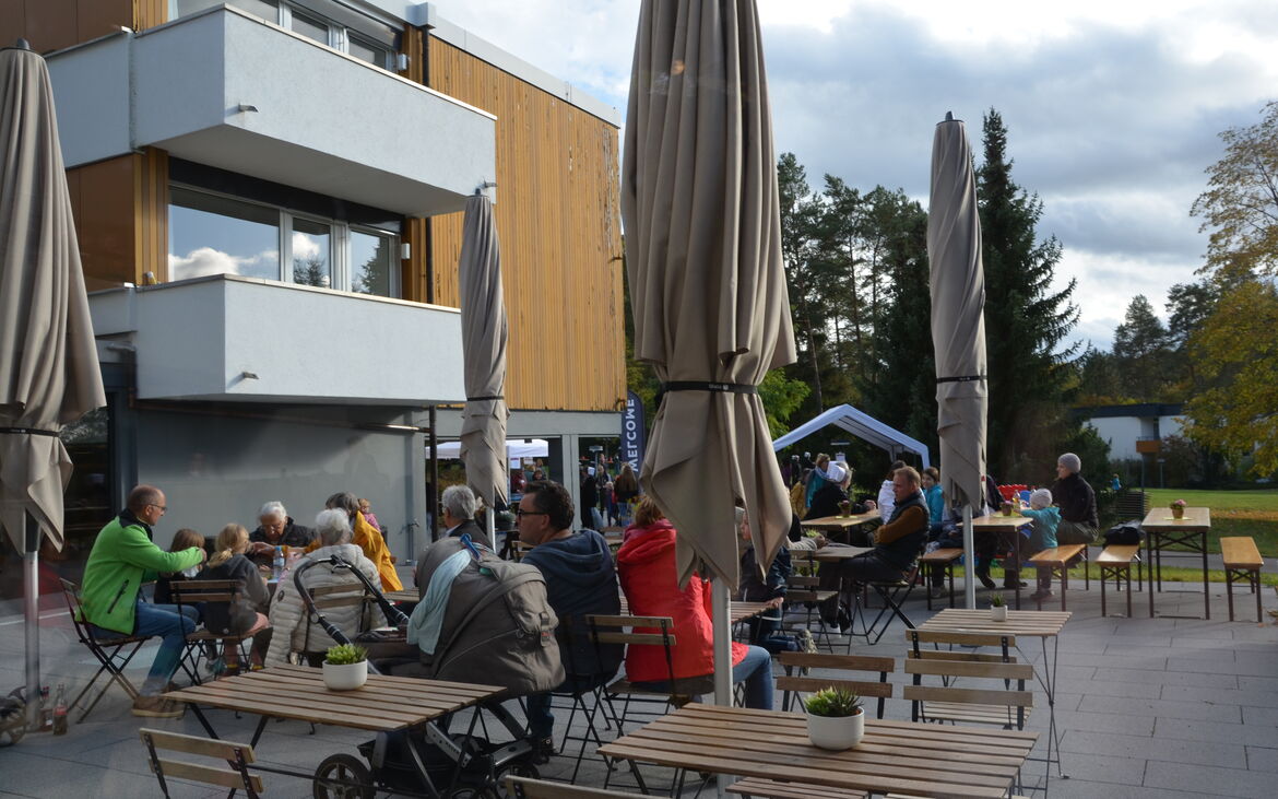 Kaffeespezialitäten, Crêpes und am Abend leckere Grillwurst lockten die Gäste, sich vor dem Zelthaus niederzulassen und den schönen Herbsttag mit Gesprächen und immer neuen Begegnungen zu geniessen. Architekt Martin Vetter zeigte indessen Interessierten das weitläufige Gelände und gab Einblicke in Architektur, Bauweise und Nutzung der Gebäude.