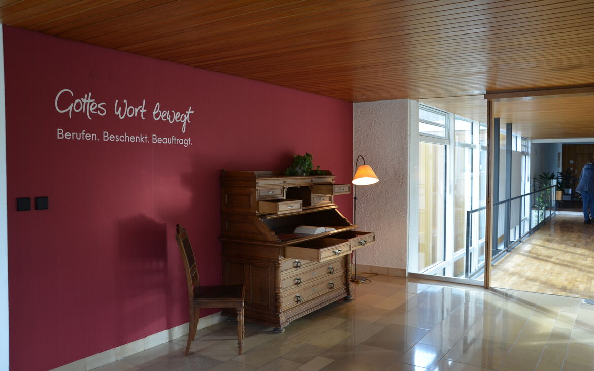 Im Foyer bekamen die interessierten Besucher einen Einblick in die Geschichte unserer Schwesternschaft. Dabei wurden verschiedene neu gestaltete Stationen im Mutterhaus bewundert. Das Motto „Gottes Wort bewegt“ zieht sich wie ein roter Faden durch die Geschichte und visuell durchs Mutterhaus. Besonders beeindruckend die alte Kommode mit einer Bibel, bei der der Besucher mittels QR-Code Informationen zu Tracht und Berufungsgeschichte der Schwestern abrufen kann.