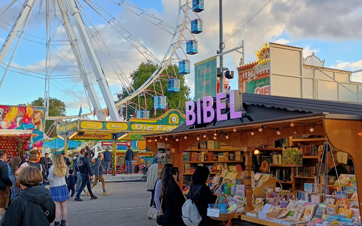 Gut, dass es noch eine Stelle auf dem Volksfest gibt, bei dem die Bibel, das wichtigste Buch, in verschiedenen Sprachen verteilt und verkauft wird. Viele Bibeln, geistliche Bücher und Kalender mit Bibelworten sind in den vergangenen Jahren beim Volksfest schon über den „Ladentisch“ gegangen. Eine sehr gute Möglichkeit, das Wort Gottes weiterzugeben. Außerdem finden wir es wichtig, dass wir Christen in der Gesellschaft präsent bleiben.